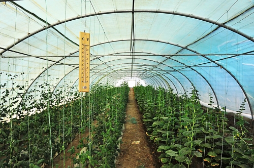 大棚內(nèi)氣溫日變化趨勢(shì)與陸地相同,但晝夜溫差變幅大。白天光照充足,如果薄膜密閉棚內(nèi)溫度升高很快,最高可達(dá)40─50℃,比棚外高20℃以上。陰雨天,增溫效果差,夜間棚內(nèi)最低氣溫一般比棚外高1─3℃。棚內(nèi)地溫比氣溫穩(wěn)定,通常為10─20℃。棚內(nèi)氣溫也因位置不同而異,大棚橫向分布為中間高、兩邊低,因此大棚中部的植株往往比兩邊的植株高大。大棚縱向分布,白天有太陽照射時(shí),溫度為頂部高、下部低,夜間、陰天則相反。