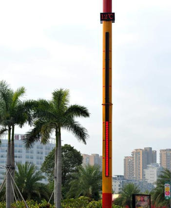 近日,福建倉山萬達廣場1號門附近,花圃內立著“巨型數(shù)字溫度計”,高約20米,直徑約0.5米,溫度計探桿黃紅色相間。溫度計上有刻度,頂部屏幕會直接顯示溫度數(shù)值,最頂端還有十幾盞照明燈,遠看像一個巨型路燈。