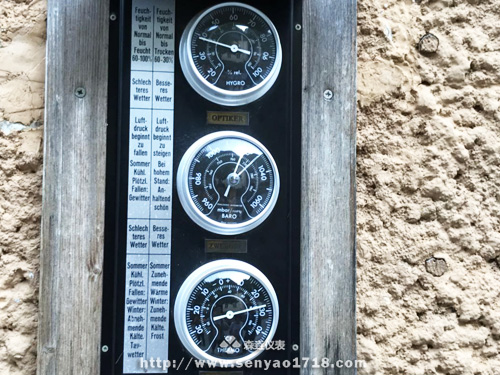 在靠近河邊的一戶人家的墻上,我們看到了這樣一款產(chǎn)品,它是集濕度計(jì)、氣壓計(jì)和溫度計(jì)與一體的。它顯示了小鎮(zhèn)的濕度、氣壓和溫度,為小鎮(zhèn)居民提供了便利,也惠及了世界各地的游客。