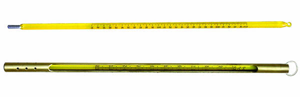 生活中我們所認知的實驗室溫度計,主要是整根的長玻璃棒溫度計,填充液煤油或者水銀等,依靠液體熱脹冷縮原理測溫。因其玻璃材質(zhì),必須小心輕放。