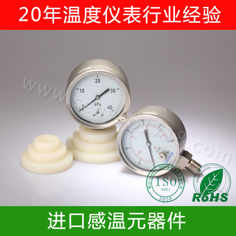 3、可采用隔膜式壓力表,目前有鉬2鈦和鉭片,膜片與彈簧管之間用甲基硅油傳送壓力,最小量程可做到0~100kPa,如果膜片材料還不耐腐,則可加一層F46(聚全氟乙丙烯)膜片,但根據(jù)介質(zhì)的滲透性,傳遞液可選用氟油,則可起雙重隔離作用。