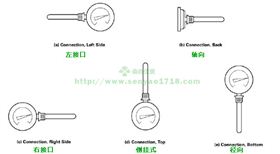 常見的雙金屬溫度計(jì)安裝方向有軸向,徑向,萬(wàn)向,但是事實(shí)上,有時(shí)候?yàn)榱藵M足客戶的特殊要求,還有其他一些特殊的安裝方向:左接頭,右接口和倒掛式,圖示如下。