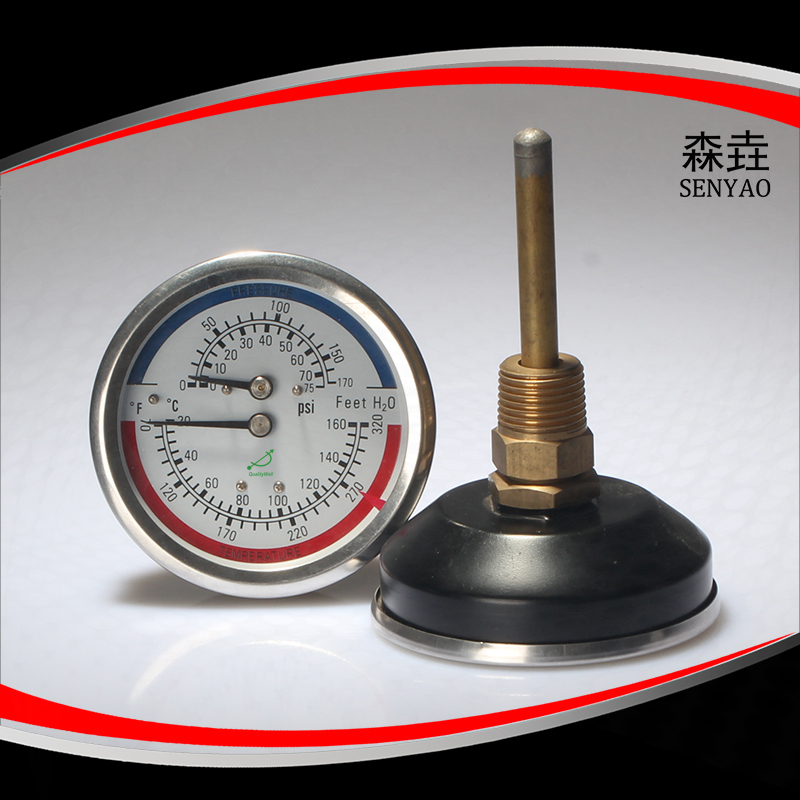 溫度壓力一體表源自德國(guó)技術(shù),既可以測(cè)量壓力,又可以測(cè)量溫度,一表多用。工廠制造過程:從焊接測(cè)漏→飽壓→校對(duì)示值→成品組裝→示值檢驗(yàn)→包裝出廠。該產(chǎn)品我們還可以根據(jù)您的要求量身定制,相應(yīng)的參數(shù)可以根據(jù)您的需要定制,方便使用。